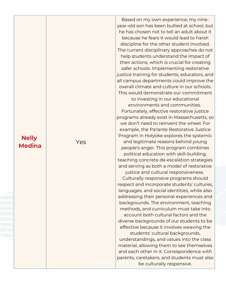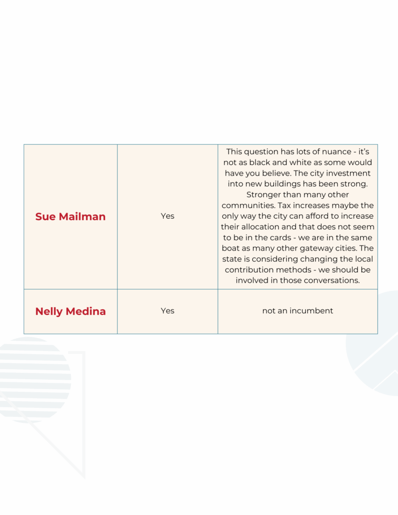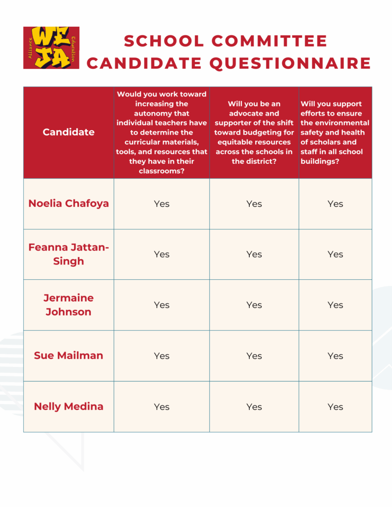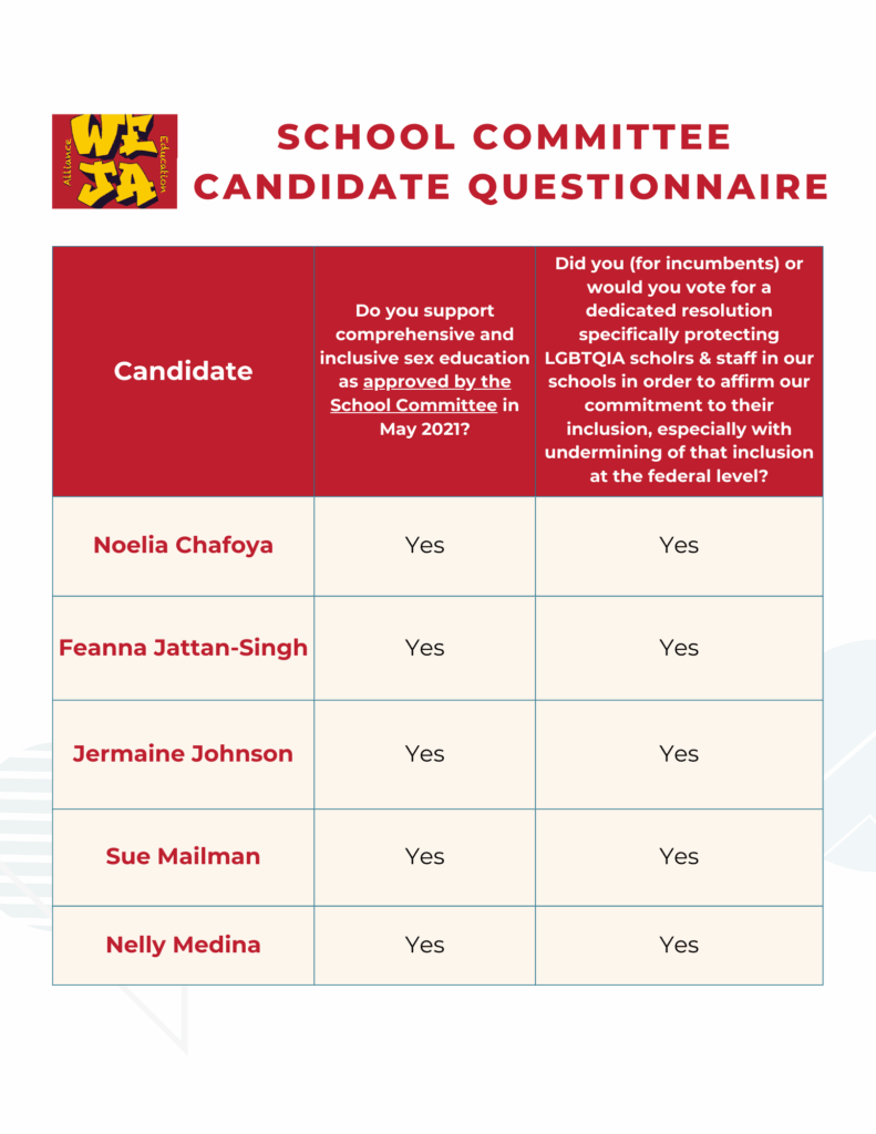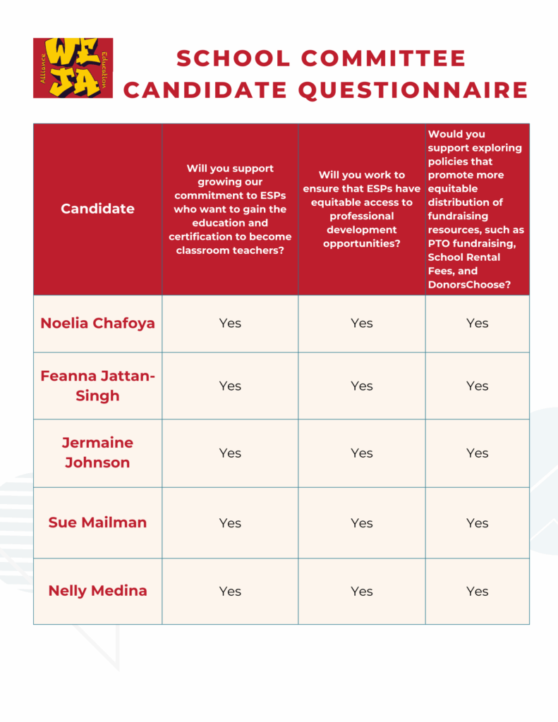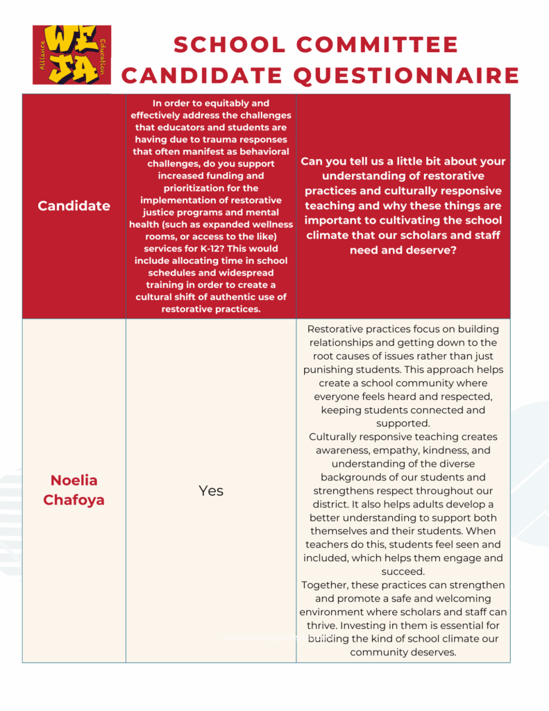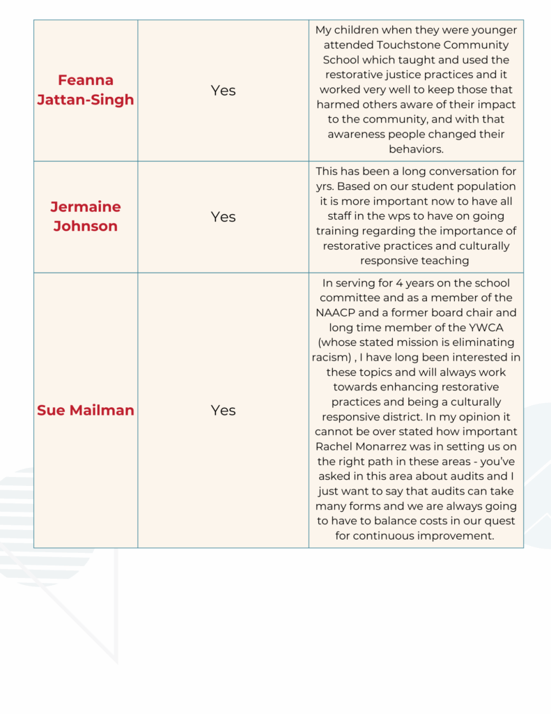 Below please see our comparison charts for the answers we received to our School Committee policy questionnaire.