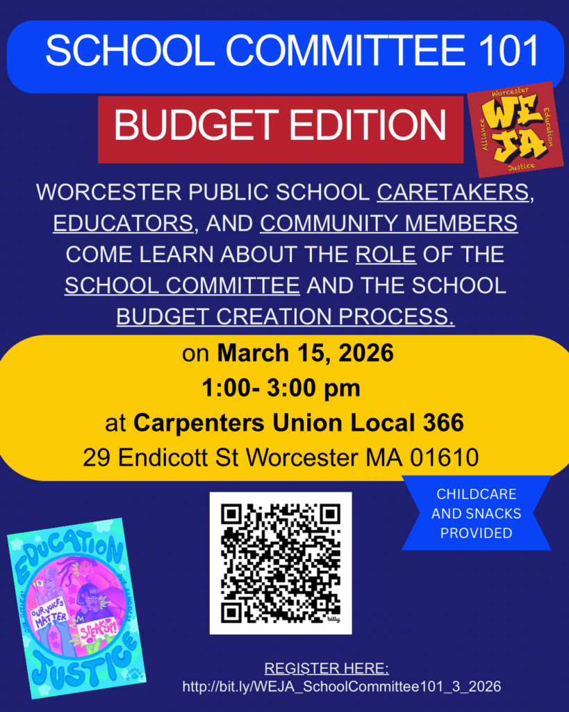 Join WEJA on Sunday, March 15 at 1:00 pm at the North Atlantic Carpenters’ Union Local 366 (29 Endicott St, Worcester) to learn about the role of the School Committee in the school budget process. WPS caretakers, educators, students, and community members all welcome! Childcare and snacks will be provided.